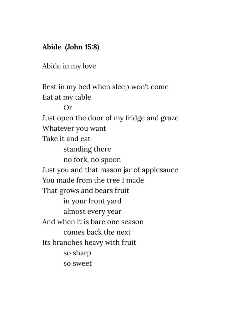 Yesterday, though, the prayer leader in our morning meeting invited us to do something different. “Put the word abide on a piece of paper,” she said, “and write a poem. Whatever comes to you.” The Zoom screen lit up with people scribbling. And as tired as I was of Jesus and his vines, all those weeks of abiding in Jesus’s love clicked for me as well.